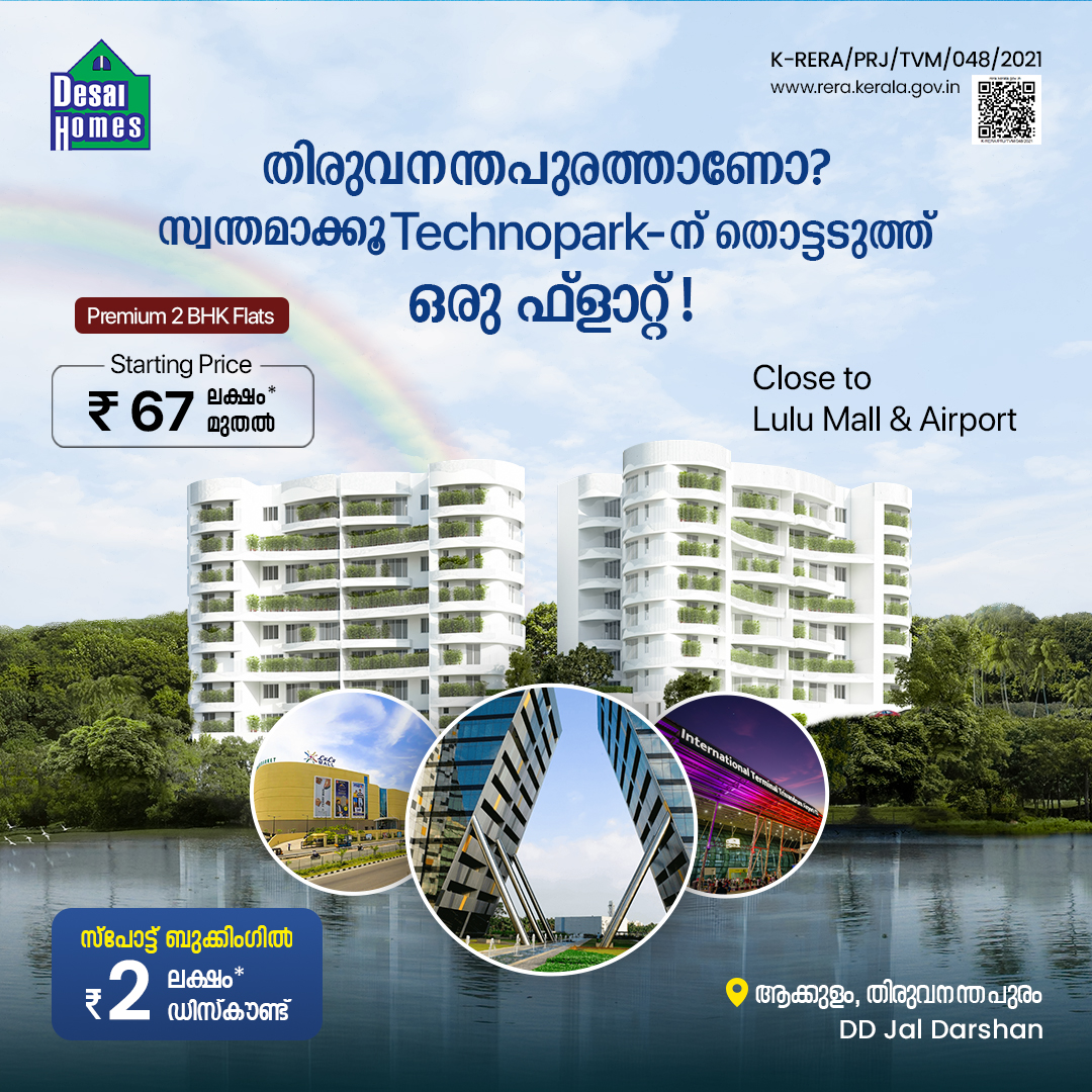 DD Jal Darshan, the twin tower waterfront apartment project of Desai Homes is located at Akkulam, Trivandrum. Spread over nearly an acre of land, the twin towers with a total of 70 units - Tower 1 with 30 units and Tower 2 with 40 units - consisting of 2 & 3 BHK luxury apartments ranging from 1192 sq.ft to 2041 sq. ft, DD Jal Darshan lets you invoke the true spirits of rejuvenated living. This skilfully designed project stands out for both its serene ambiance as well as the modern facilities.