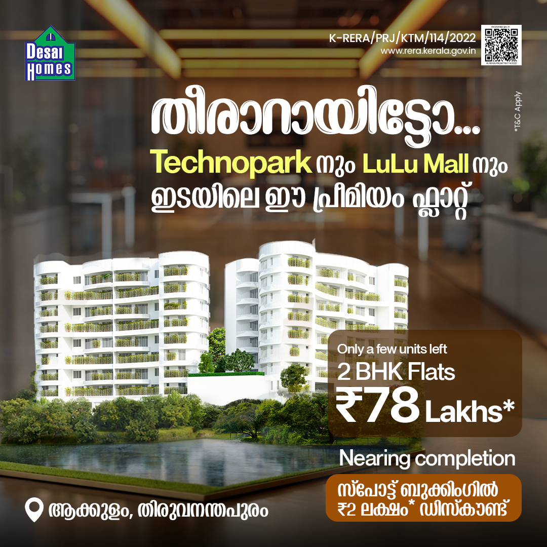 DD Jal Darshan, the twin tower waterfront apartment project of Desai Homes is located at Akkulam, Trivandrum. Spread over nearly an acre of land, the twin towers with a total of 70 units - Tower 1 with 30 units and Tower 2 with 40 units - consisting of 2 & 3 BHK luxury apartments ranging from 1192 sq.ft to 2041 sq. ft, DD Jal Darshan lets you invoke the true spirits of rejuvenated living. This skilfully designed project stands out for both its serene ambiance as well as the modern facilities.