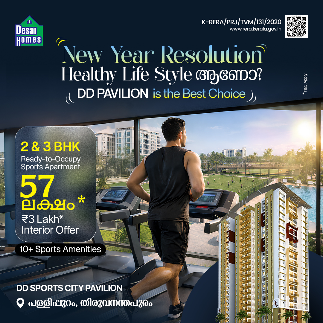 Pavilion is an exceptional architectural marvel that will compel you to live the life you've always dreamed of. Majestic and resplendent, Pavilion is 20 floors and 160 apartments of pure bliss. Being Kerala's first sports themed residential project, DD Sports City is host to 125 cents of the beautiful DD Pavilion. 2 & 3 BHK apartments ranging from 993 sq.ft. to 1284 sq.ft. make for perfect living spaces. Surround yourself with the best of the best as you embark on a spectacular journey at your new home.